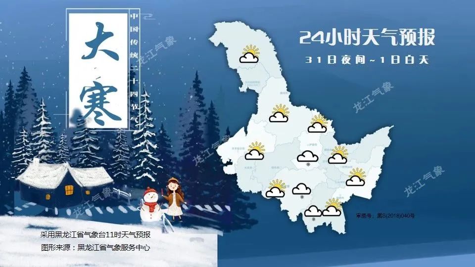 31日夜间最低气温:大兴安岭北部-41~-39℃,大兴安岭南部-35~-33℃,黑河、伊春、齐齐哈尔北部、绥化北部、哈尔滨-30~-28℃,齐齐哈尔南部、大庆、双鸭山-25~-23℃,其它地区-27~-25℃。