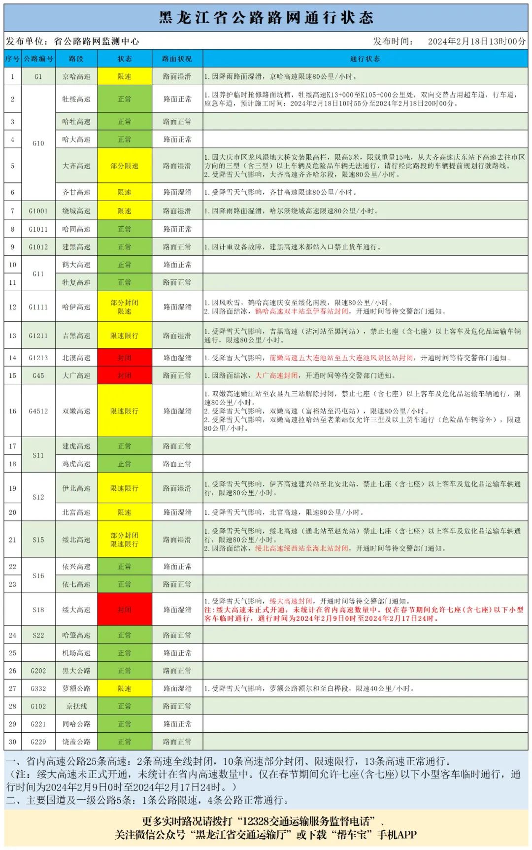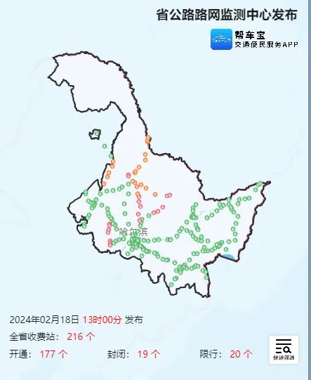 2月18日13时汇总路况信息:全线封闭的高速有(2条高速):绥大高速(未正式开通,未统计在省内高速数量中)、北漠高速、大广高速,封闭。